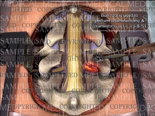 Lumbar spine surgical animation depicts a posterior lateral two level fusion at L4, L5 & S1 to decompress nerve roots. Incision is made posteriorly, from L4 to S1 vertebral spines. Laminectomies are performed along with removal of the spines at L4-5 & L5-S1. Nerve root is mobilized to allow access into the spinal canal. Discectomy is performed at L4-5 & L5-S1 in order to decompress the spine. Spacers (Cages) and bone graft are then inserted in between the vertebras at L4-5 & L5- S1, in order to maintain disc height. Six pedicle screws are place bilaterally at L4, L5 & S1. Two rods are inserted bilaterally at L4-S1 to complete the fusion.