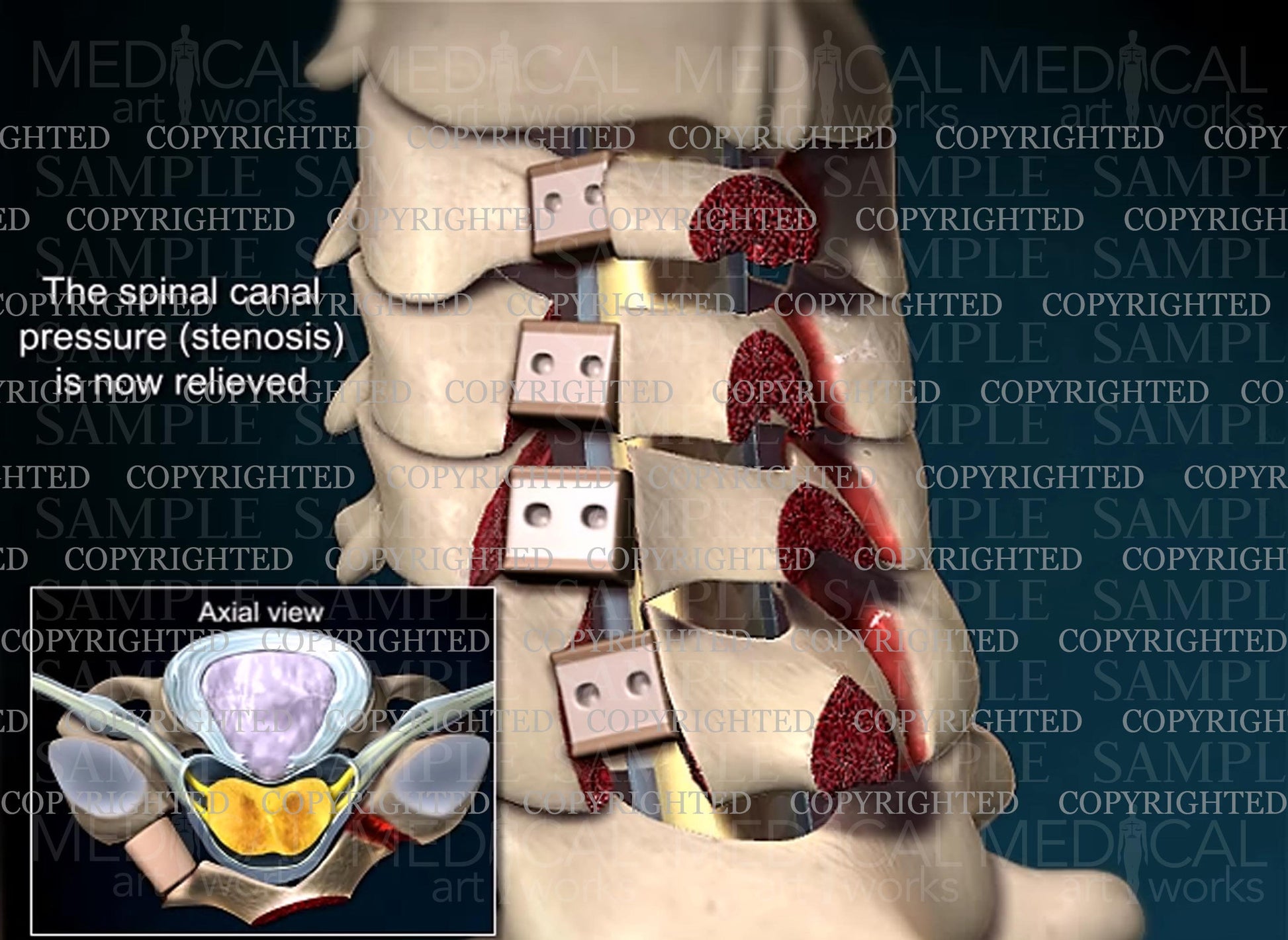 Cervical spine animation depicts an open door laminoplasty to relieve spinal stenosis (decompression). The various steps of the procedure are shown from exposure to the C3-C7 cervical spine, burring of the laminas to open the door and insertion of prosthetic grafts.
