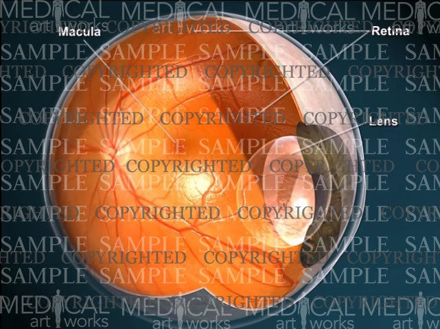 Eye animation depicts the normal anatomy of the eye. Pupil, iris, sclera, optic nerve, cornea, retina and retinal vessels are all depicted