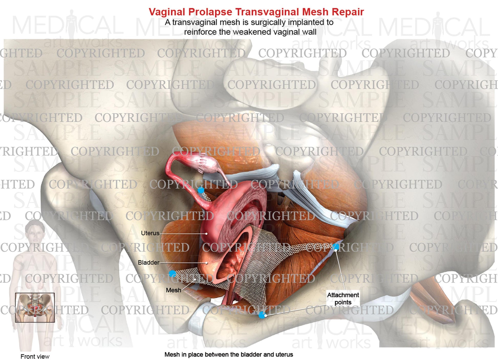 The anterior wall weakens or tears, causing the bladder to herniate into the vagina. A transvaginal mesh is surgically implanted to reinforce the vaginal wall.