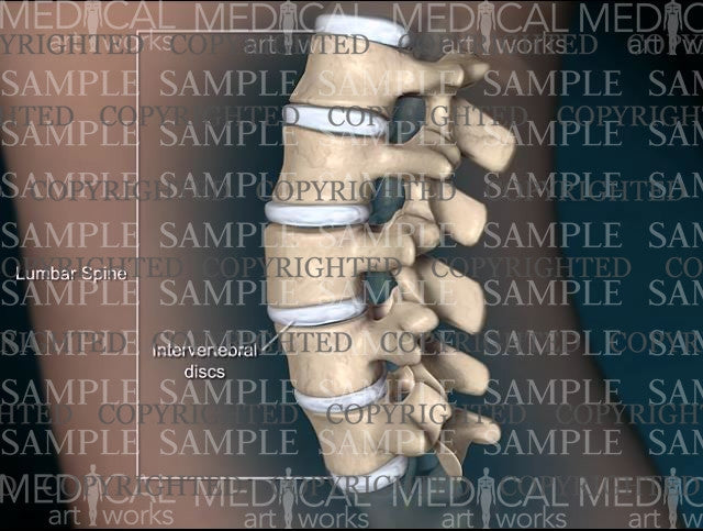 Female lumbar spine depicts the normal lumbar anatomy showing the lumbar vertebrae, intervertebral discs, spinal cord, cauda equina, thecal sac, annulus, nucleus pulposus, and nerve roots.