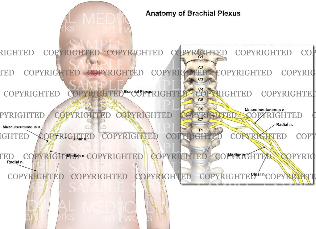Medical illustration depicts the brachial plexus nervous system of an infant