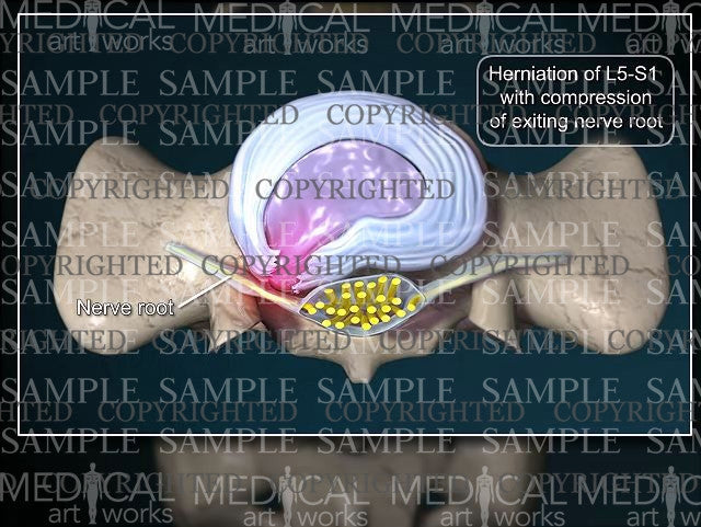 Lumbar spine animation depicts the normal anatomy showing the lumbar vertebrae, inter-vertebral discs, spinal cord, cauda equina, thecal sac, annulus, nucleus pulposus and nerve roots along with a paracentral disc herniation (protrusion) with encroachment and impingement on the exiting nerve root which can lead to paresthesia and sciatica. This type of injury may be an acute or chronic condition that can produces symptoms such as, tingling, burning, aching pain along the specific nerve root distributions from the lower back down the leg and into the foot.