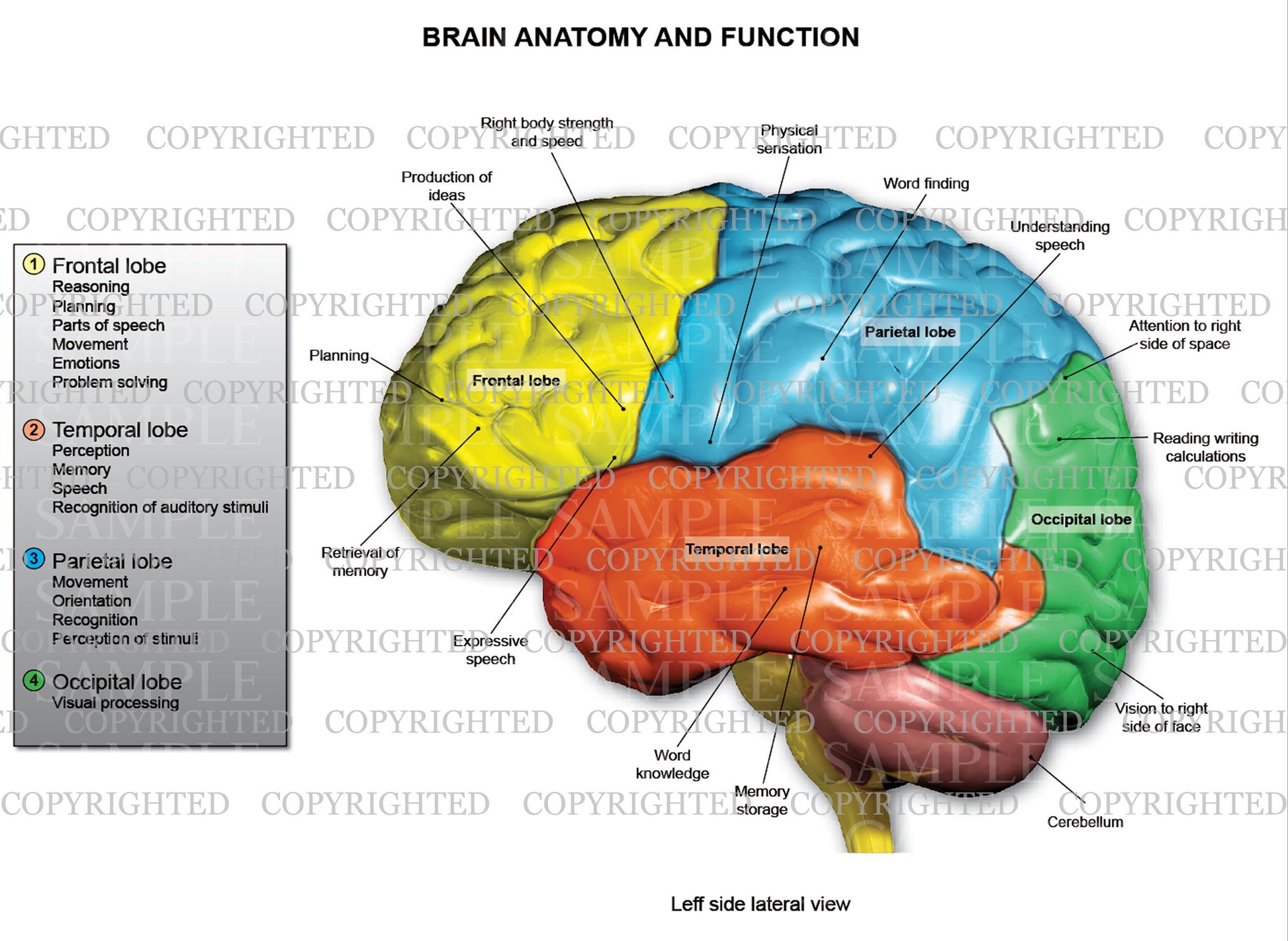 Normal anatomical illustration of the brain's Frontal lobe, Parietal lobe, Temporal lobe, Occipital lobe depicted in a lateral view. The various functions of the brain are mapped out.