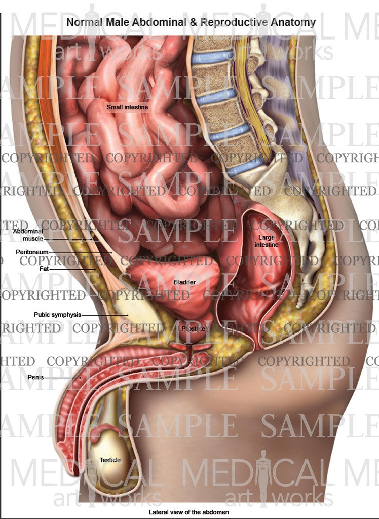 Abdominal anatomy of a male depicts a lateral and sagittal view of the small intestine, abdominal wall layers, lumbar spine, and reproductive organs.