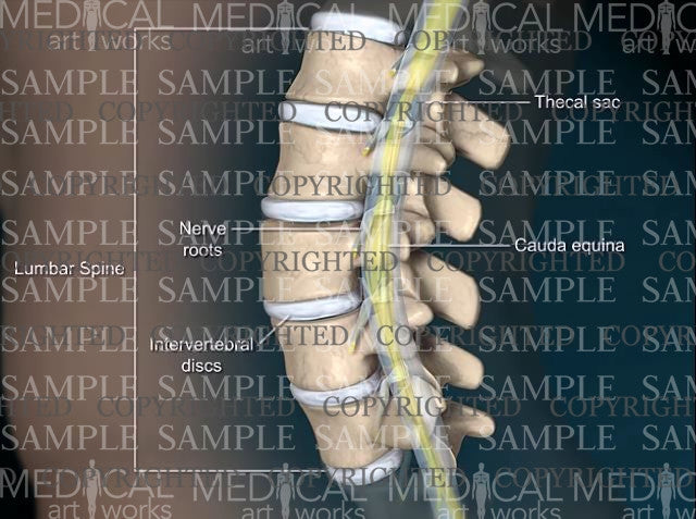 Male lumbar spine 3D animation depicts the normal lumbar anatomy showing the lumbar vertebrae, intervertebral discs, spinal cord, cauda equina, thecal sac, annulus, nucleus pulposus, and nerve roots.