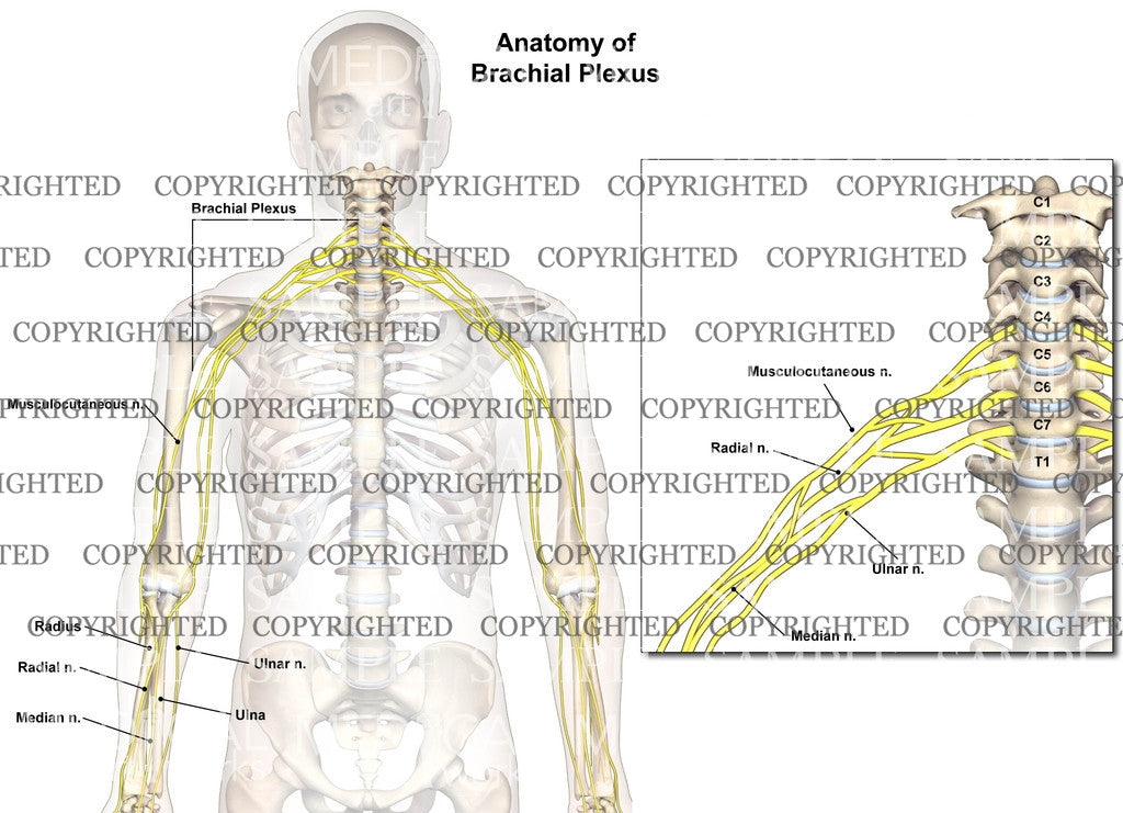Medical illustration depicts the brachial plexus nervous system