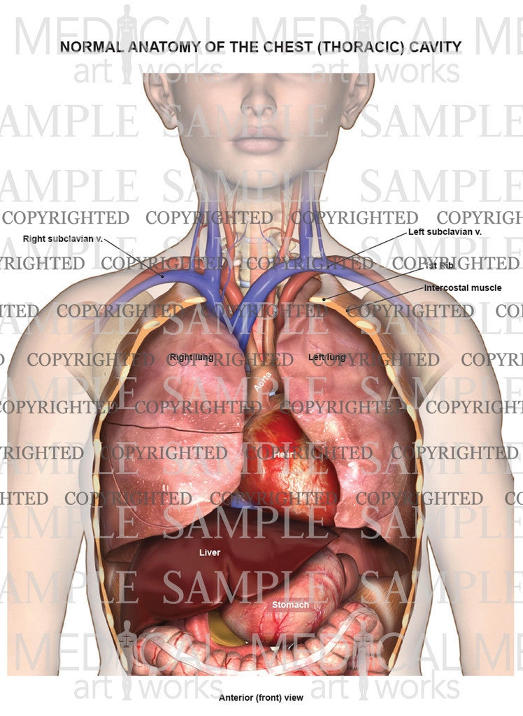 Normal anatomy of the thoracic cavity and abdomen shows a cut away of the ribs and intercostal muscle to show the heart, aorta, lungs, liver and stomach.