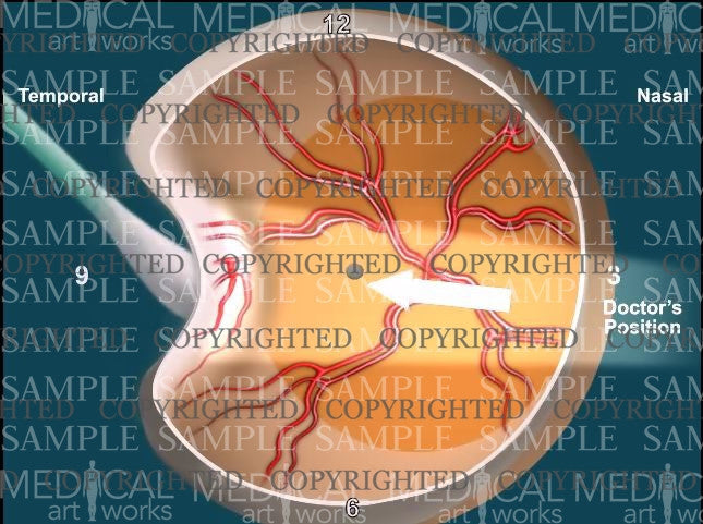 Proper eye exam on a premi to check for ROP depicts the pupil being dilated, placement of a diopter, view of the 3 zones of the retina and a scleral depression on the lateral side of the eye. Retina is viewed in its entirety for proper retinal vessel growth into all the zones.