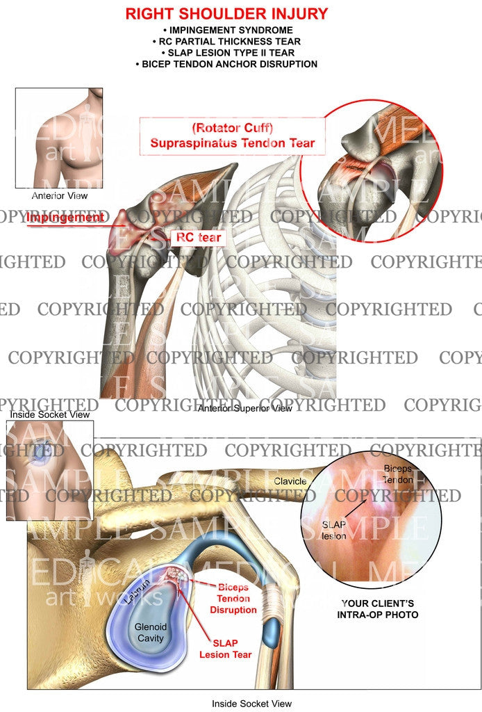Impingement syndrome. RC partial thickness tear. SLAP lesion type 2 tear. Bicep tendon anchor disruption.
