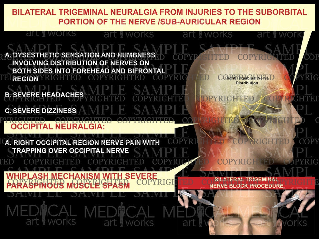 Bilateral Trigeminal Neuralgia from injuries to the suborbital portion of the nerve /sub-auricular region. Occipital neuralgia: right occipital region nerve pain with trapping over occipital nerve. Bilateral Trigeminal Nerve block procedure