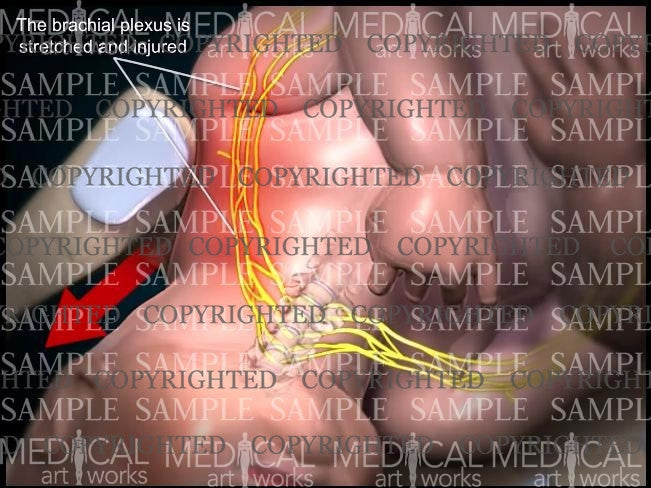 the pubic symphysis causing stretching of the brachial plexus nerves.