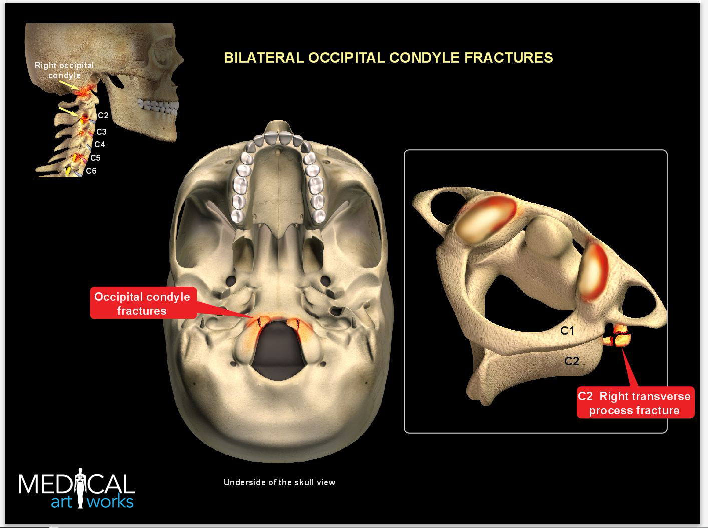 The skull injury depicts a bilateral occipital condyle fractures along with a cervical C2 right transverse process fracture.