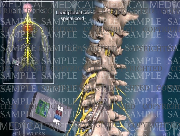 3D animation depicting a spinal cord stimulator implant inserted percutaneously into the spinal canal to block pain signals after spinal injury. The device sends electric currents to your spinal cord to interrupt pain signals from reaching the brain.
