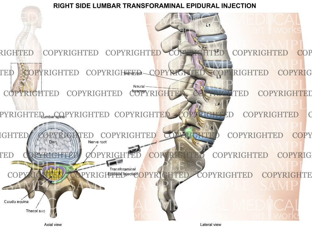 Lumbar Transforaminal Epidural Injection of a male depicts two views of the injection into the L5-S1 neural foramen space around the thecal sac and nerve root to alleviate pain.